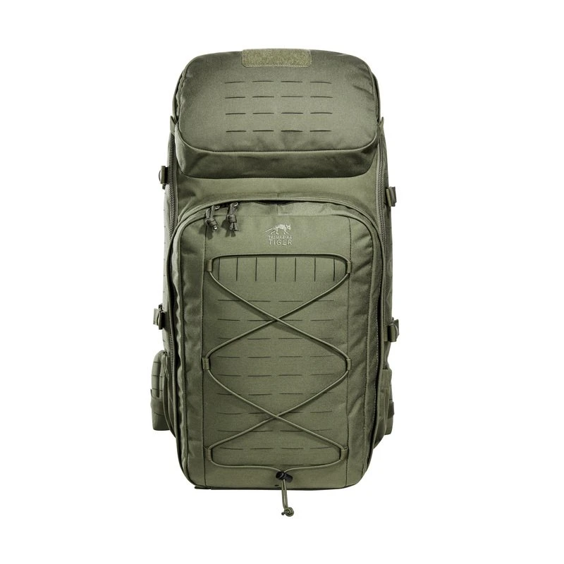 – Zwei Fronttaschen mit Organizer, Netztaschen und MOLLE-Klett