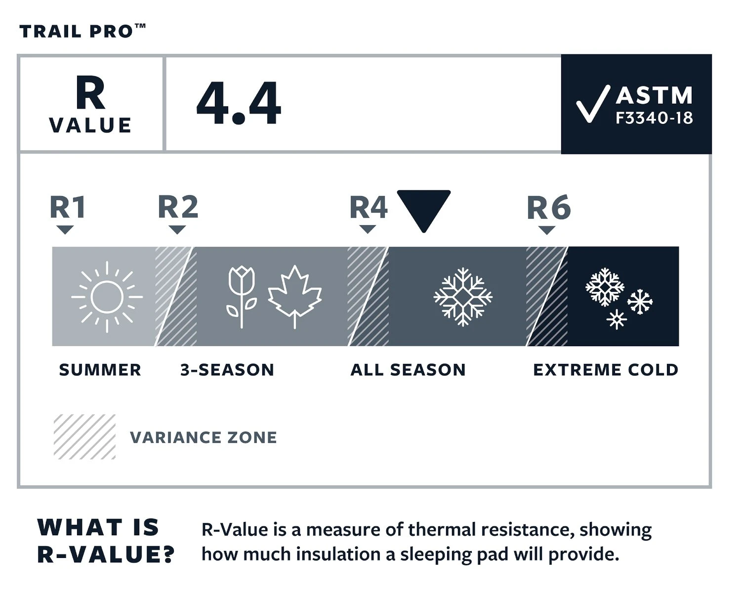 Die Trail Pro mit Ihrer für vier Jahreszeiten geeigneten Wärmeleistung und legendären Stützkraft bietet unübertroffenen Komfort bei allen Unternehmungen. Der selbstaufblasende Schaumstoff ist 7,6 cm hoch und hat eine StrataCore-Konstruktion mit dem besten Wärme-Gewichts-Verhältnis aller selbstaufblasenden Schaumstoffmatten. Der R-Wert von 4,4 ermöglicht ein ganzjähriges, ungetrübtes Outdoor-Erlebnis. Die vielseitige, selbstaufblasende Matte hat ein hochwertiges WingLock-Ventil, mit dem die Matte dank der größeren Öffnung und Aufblasen in nur eine Richtung drei Mal schneller aufgeblasen werden kann. Wie alle Matten von Therm-a-Rest wird die Trail Pro aus Qualitäts- und Umweltschutzgründen im Inland hergestellt. Zum Lieferumfang gehört ein kompakter Packsack.