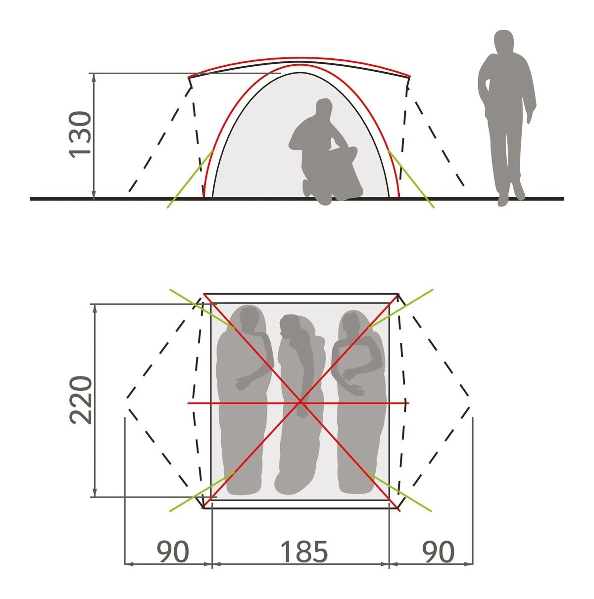 • Außenzelt: 100% Polyester; 75 D Polyurethane coated 3.000 mm;